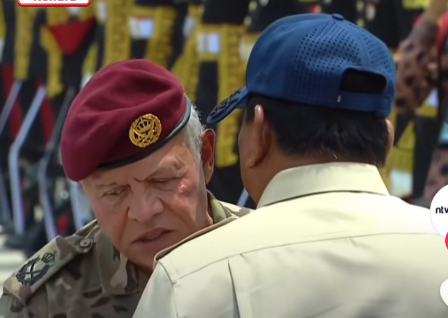 President Prabowo wore a safari outfit paired with a navy-blue cap, while King Abdullah appeared in his Jordanian military uniform complete with a red beret.