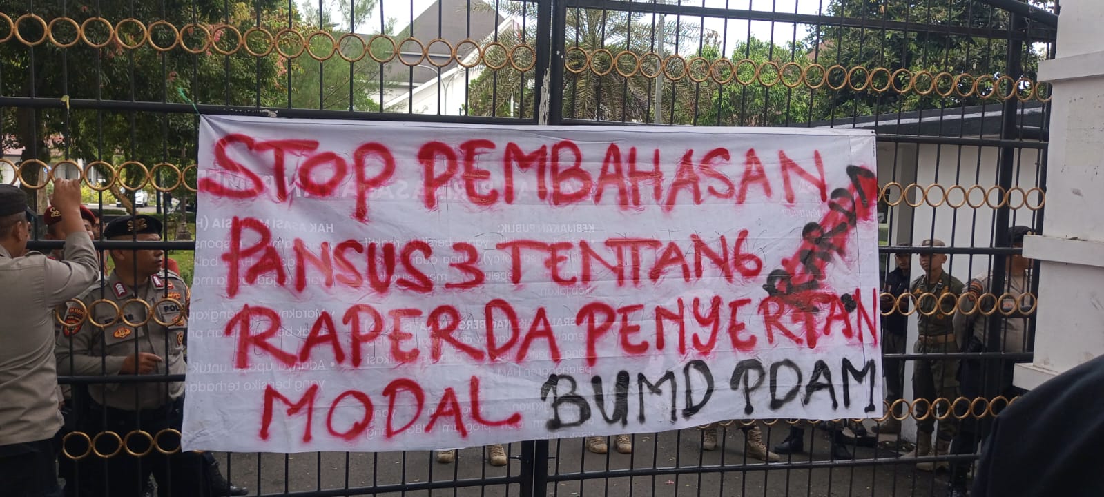 “Intinya hari ini kami melaksanakan aksi karena ada beberapa hal yang ingin kami sampaikan. Salah satunya kami meminta agar pembahasan raperda penyertaan modal PDAM dihentikan jika tidak didukung naskah akademik dan kajian yang memadai,” ujarnya.