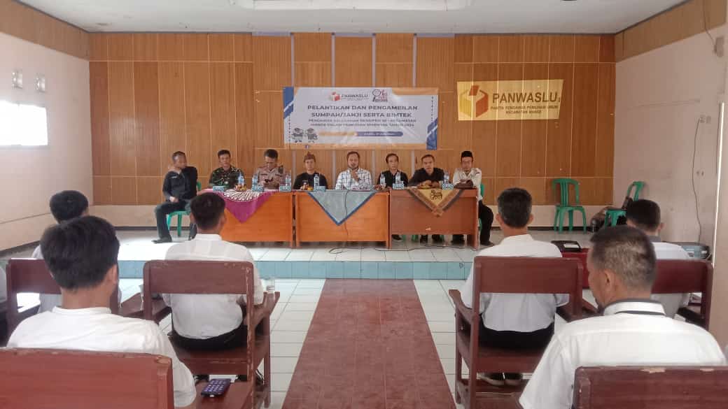 Cianjur, Panwas Kecamatan Mande melaksanakan kegiatan pelantikan dan pengambilan sumpah/Janji Serta Bimtek Pengawas Kelurahan Desa (PKD) se Kecamatan Mande di Gedung eks. Desa Bobojong, Kecamatan Mande, Kabupaten Cianjur, Jawa Barat, Sabtu, (1/6/24).