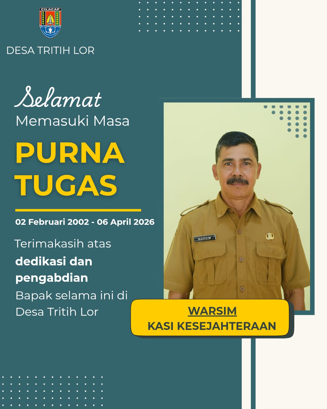 CILACAP – Journal News , Setelah mendedikasikan diri selama 24 tahun, Bapak Warsim, Kepala Seksi (Kasie) Kesejahteraan Desa Tritih Lor, Kecamatan Jeruklegi, Kabupaten Cilacap, resmi memasuki masa purna tugas terhitung mulai tanggal 6 April 2026.