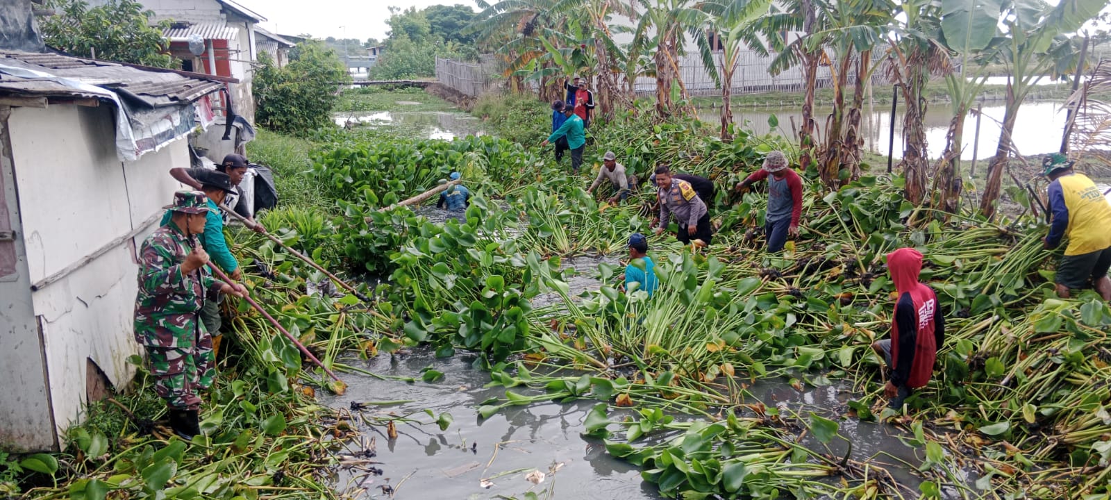 Dalam kegiatan tersebut, Polri dan TNI hadir ditengah warga binaan dengan menjebur ke sungai guna membersihkan eceng gondok dan tumpukan sampah yang tersangkut di eceng gondok, serta mengangkat sampah rumah tangga dan material lain yang berpotensi menghambat aliran air sungai.