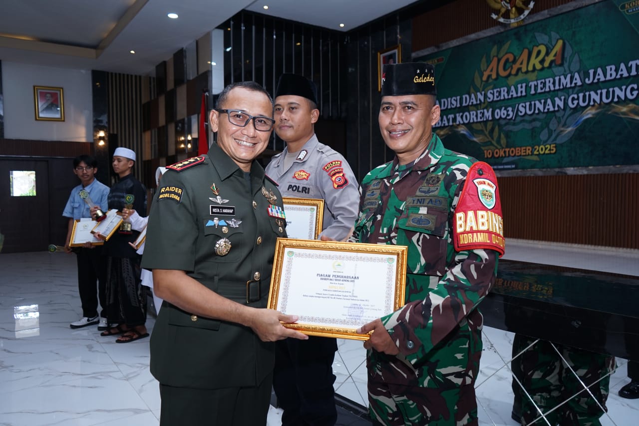 Journal news /kota Cirebon – Komando Resor Militer (Korem) 063/Sunan Gunung Jati menggelar Acara Tradisi dan Serah Terima Jabatan (Sertijab) sejumlah pejabat di lingkungan Korem 063/SGJ, serta pemberian hadiah kepada para pemenang Lomba Keagamaan dalam rangka memperingati HUT ke-80 TNI Tahun 2025, bertempat di Aula Sunan Gunung Jati Korem 063/SGJ, Jl. Brigjen Darsono, Kota Cirebon, Jumat (10/10/2025).