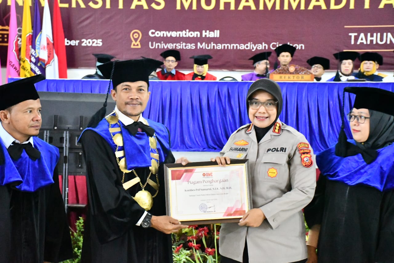 Journal news.id.Kapolresta Cirebon KOMBES POL. SUMARNI, S.I.K., S.H., M.H, menerima Penghargaan TOKOH TELADAN PEDULI GENERASI MUDA dalam Wisuda ke-33 Universitas Muhammadiyah Cirebon Tahun Akademik 2024–2025 di Convention Hall Universitas Muhammadiyah Cirebon Jl. Fatahillah Kel. Watubelah Kec. Sumber Kab. Cirebon, Sabtu (25/10/2025).