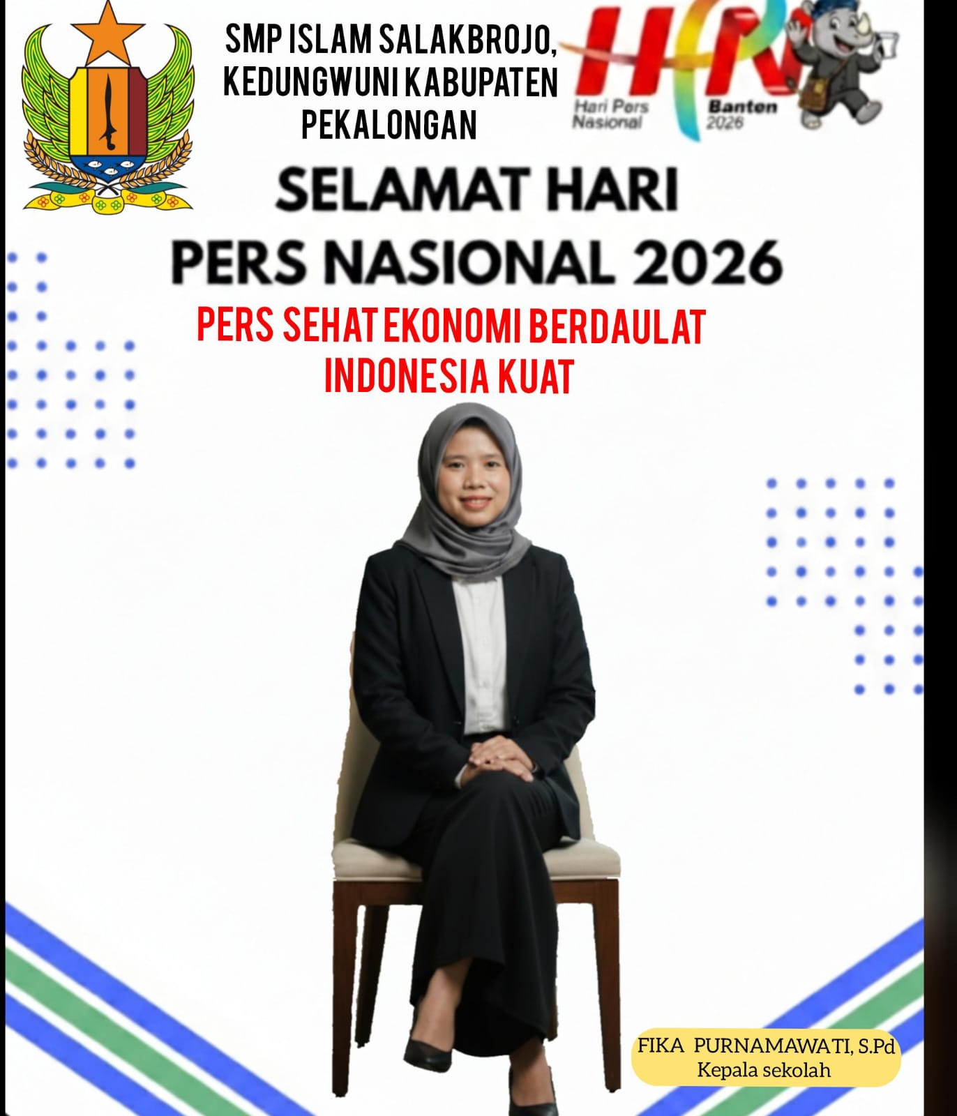 Kepala Sekolah SMP Islam Salakbrojo Kedungwuni Kabupaten Pekalongan Fika Purnamawati, S.Pd Mengucapkan Selamat Hari Pers Nasional 2026. “Pers adalah pilar demokrasi. Selamat Hari Pers Nasional 2026, semoga semangat independensi dan profesionalisme selalu menyala dalam setiap karya jurnalistik “.