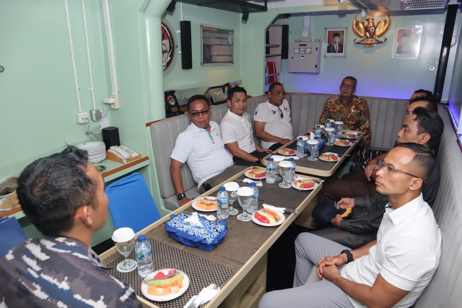 Komandan KRI Golok-688 Letkol Laut (P) Putu Agus Harianto S.H.,M.Tr.Opsla didampingi Palaksa Mayor Laut (P) Poetra Parlindungan Sitanggang dan Perwira KRI menerima Courtessy Call (CC) Forum Koordinasi Pimpinan Daerah (Forkopimda) Kota Cirebon bertempat di bridge deck dan longroom KRI Golok – 688 yang sandar di Dermaga Pelita II Pelabuhan Cirebon, Kamis (12/10/2023)
