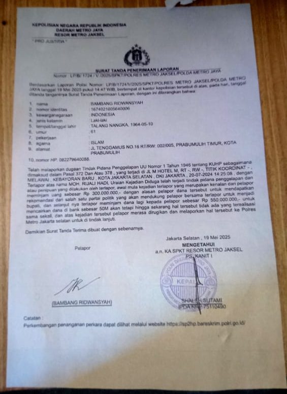 Laporan itu tertera dalam Surat Tanda Penerimaan Laporan Nomor: LP/B/1724/V/2025/SPKT/Polres Metro Jaksel/Polda Metro Jaya, tertanggal 19 Mei 2025 pukul 14.47 WIB.