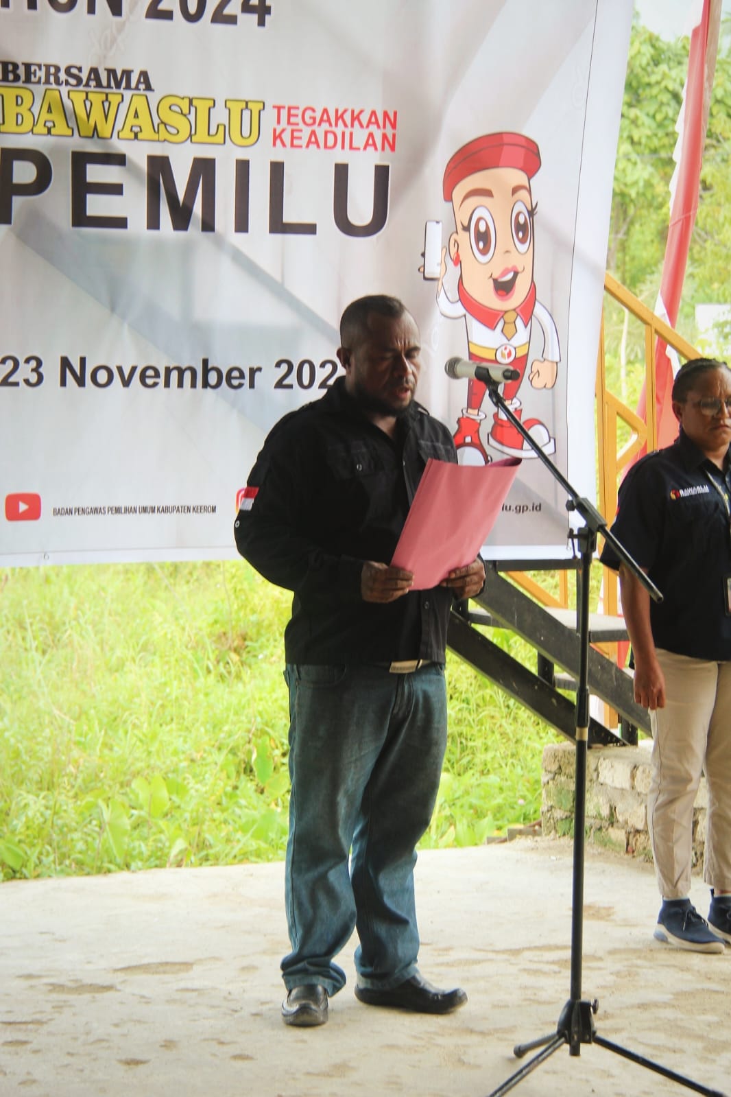 Ketua Bawaslu Keerom Yaser A. Runggamusi, S.Ip dalam apel membacakan 10 butir amanat Bawaslu diantaranya :