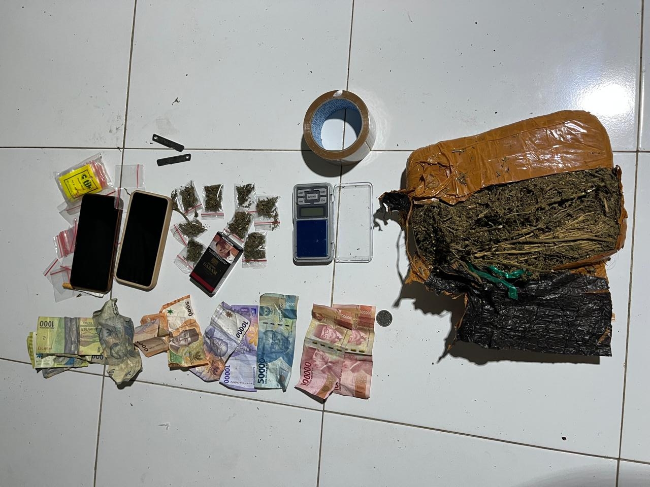 Dari hasil penangkapan, petugas menemukan sejumlah barang bukti berupa satu paket besar ganja, delapan paket kecil ganja siap edar, satu unit timbangan, uang tunai sebesar Rp. 294 ribu, serta perlengkapan lain yang diduga digunakan untuk aktivitas peredaran narkotika.