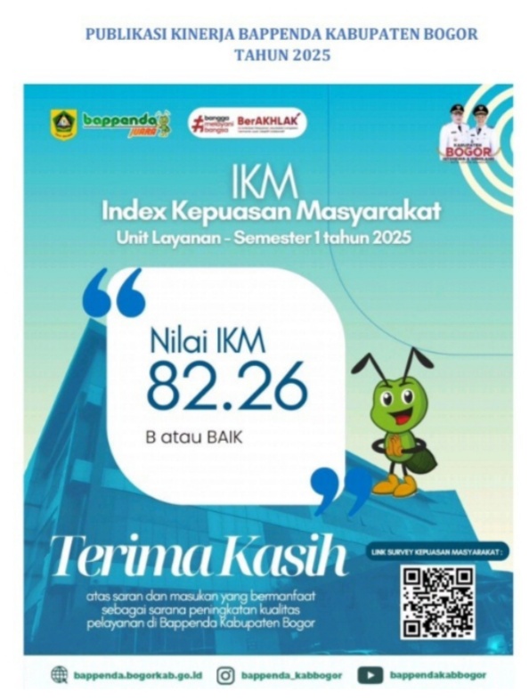 Bappenda Kabupaten Bogor mengucapkan terima kasih sebesar-besarnya atas saran dan masukan yang telah diberikan selama ini. Komitmen pelayanan yang berakar pada nilai AKHLAK dan semangat inovasi akan terus dijaga, agar seluruh masyarakat benar-benar merasakan manfaat pelayanan yang cepat, akurat, dan ramah.