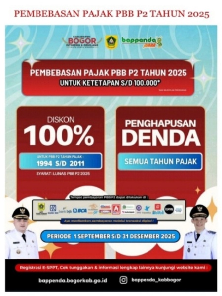 Mulai 1 September hingga 31 Desember 2025, masyarakat dapat memanfaatkan diskon 100% untuk PBB P2 tahun pajak 1994 hingga 2011, asalkan telah melunasi PBB P2 tahun 2025. Untuk wajib pajak yang nilai ketetapan pajaknya maksimal Rp100.000,- Pemerintah Kabupaten Bogor memberikan pembebasan penuh: pajak dianggap langsung lunas untuk tahun 2025 tanpa perlu melakukan pembayaran lagi dan kebijakan ini berlaku tanpa batas waktu.