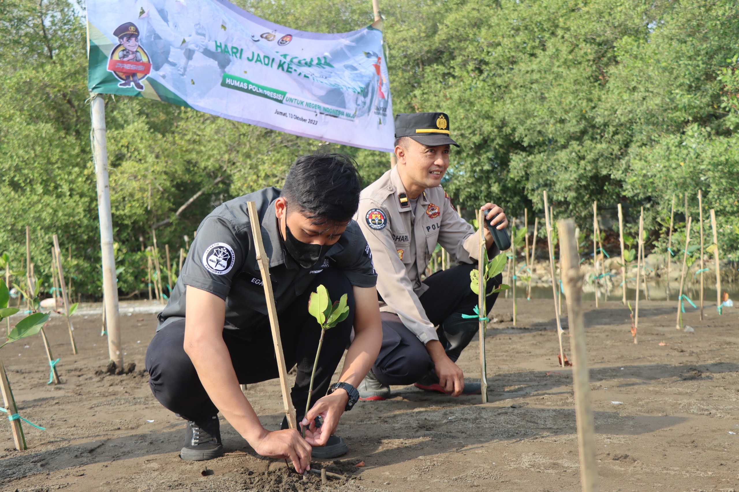 POLRES CIREBON KOTA,-Dalam rangka memperingati HUT Humas Polri ke-72, Seksi Humas Polres Cirebon Kota melakukan penanaman 100 bibit pohon mangrove di pesisir pantai Kejawanan, Kota Cirebon, Jum’at (13/10/23).