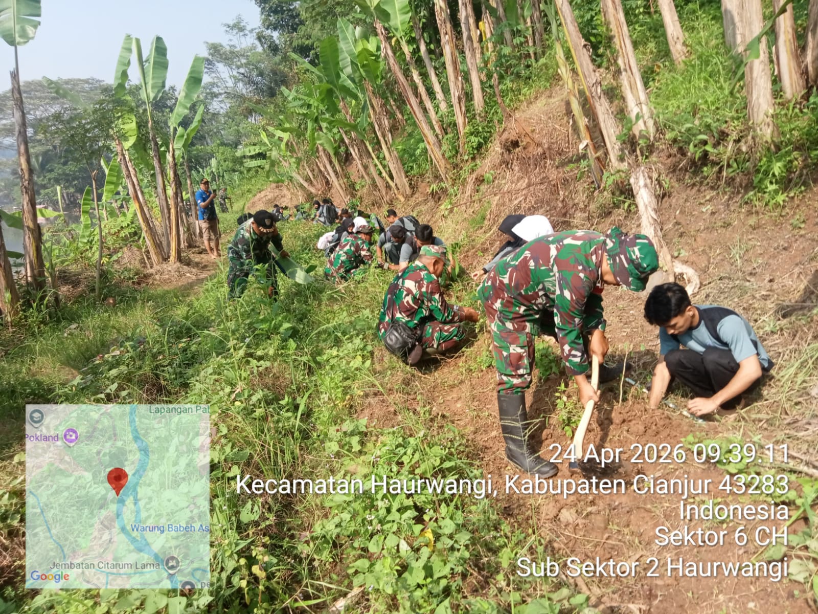 Cianjur – Satgas Citarum Harum Subsektor 2 Sektor 6 bersama ratusan siswa SMKN 1 Haurwangi melaksanakan penanaman ratusan bibit pohon di bantaran Sungai Citarum, Kampung Muhara RT 001/010, Desa Haurwangi, Kecamatan Haurwangi, Kabupaten Cianjur, Jumat (24/4/26).