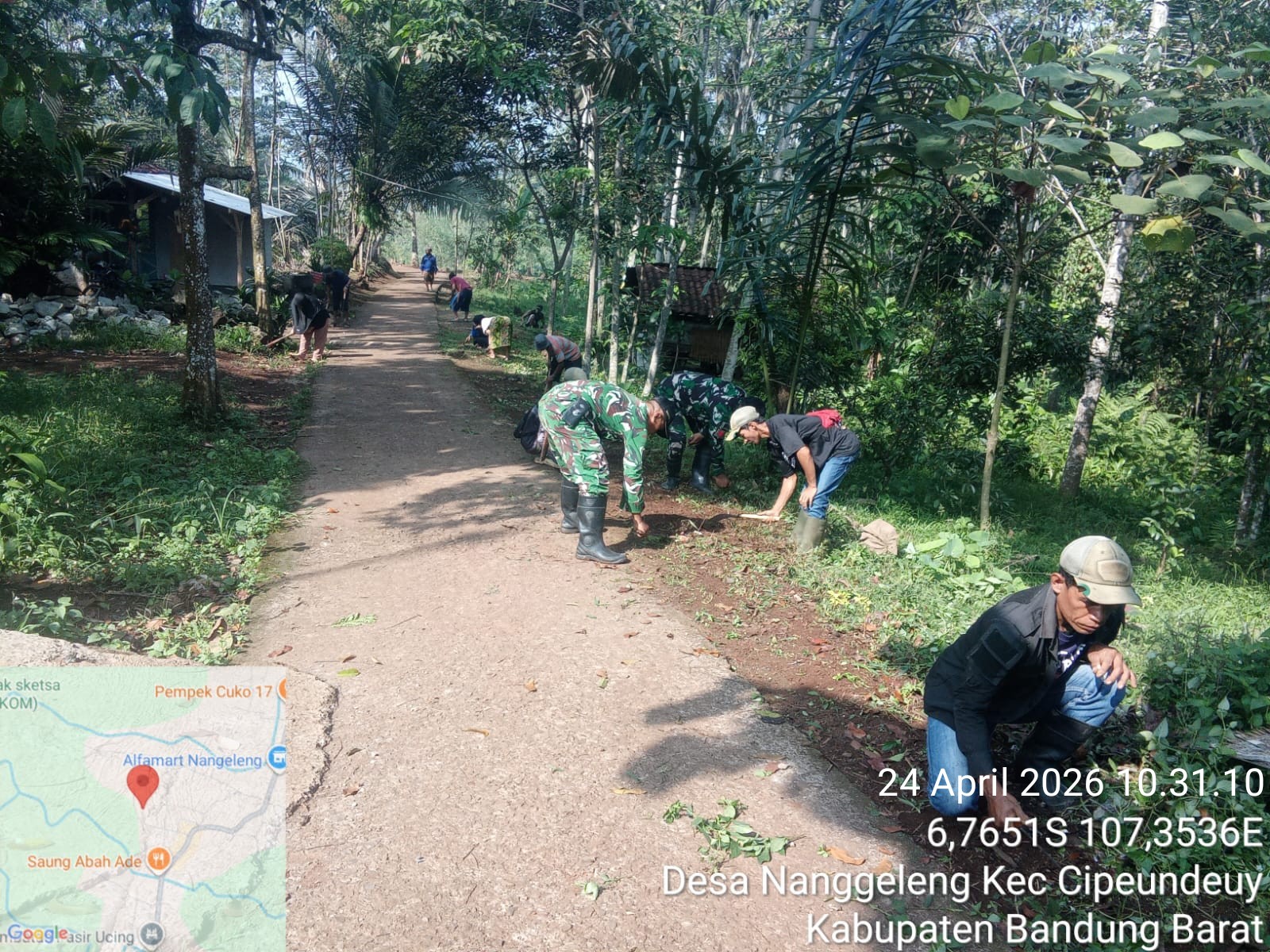 Pukul 08.00 hingga 11.30 WIB, personel dan warga membersihkan sampah rumah tangga serta sampah liar yang menumpuk di permukiman dan saluran air di wilayah RT 01/10 Kp Cibuntu, Desa Nanggeleng.