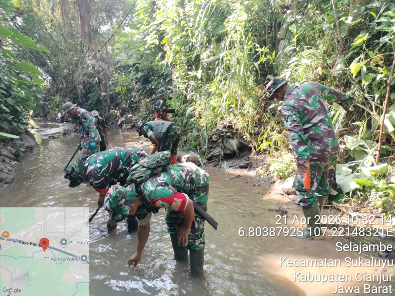 Cianjur – Satgas Citarum Harum Subsektor 3, Sektor 6 Cianjur melaksanakan pembersihan sampah di aliran Sungai Cicantu, Kampung Manik, Desa Salajambe, Kecamatan Sukaluyu, Kabupaten Cianjur, Selasa (21/4/26).